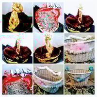 Gift baskets are available for order and can be ordered at any age or occasion! Each basket is hand-painted and decorated. Custom baskets for all occasions can be ordered in two sizes, small or large. A beautiful bow trims the top of the basket, and each basket can be customized to suit any age! Baskets are detailed by hand with lace, colored ribbon, and gemstones that match the basket's color scheme. If you would like your basket to hold special items, you can add them to the custom order form, and we will do our best to accommodate your requests.